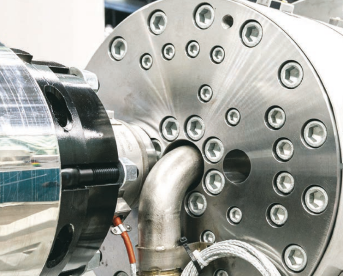 Each extrusion line for pipe head is manufactured to meet the specific needs and process parameters of each processed material and desired final product. All the die heads for pipe are equipped with interchangeable pins and bushings to speed up the change of measurement and of special spokes, designed to optimise the flow of the thermoplastic material.
